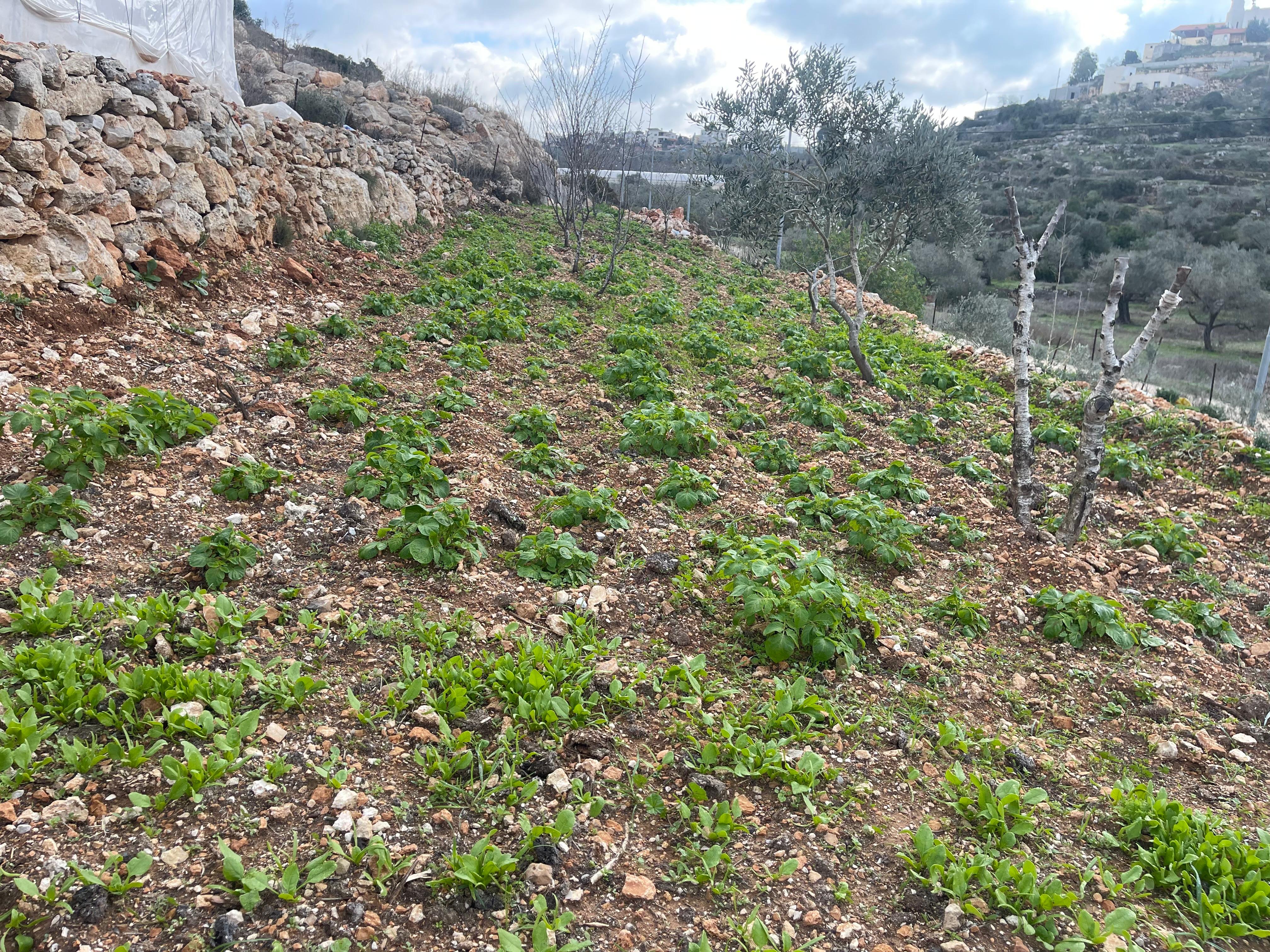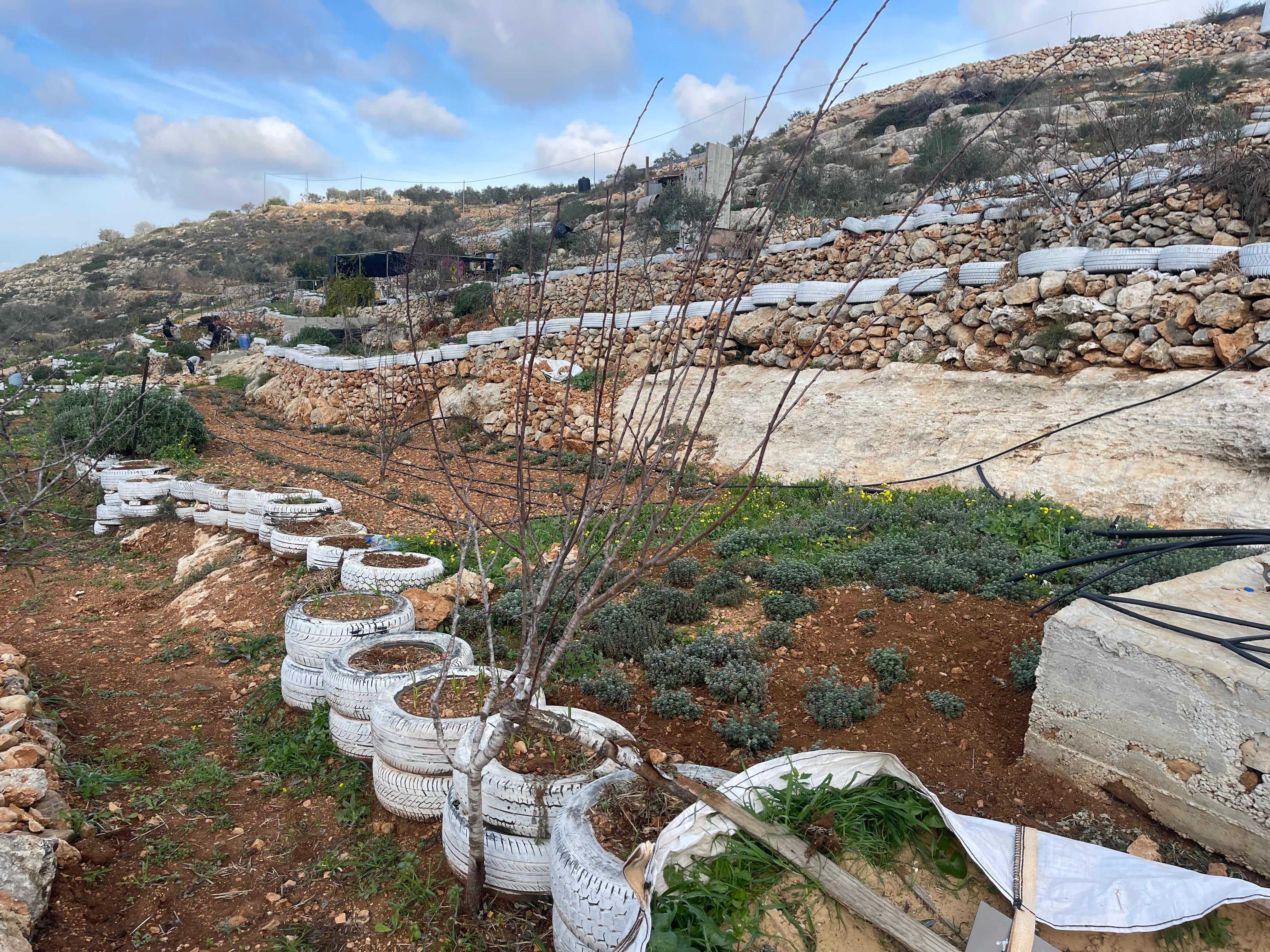 Farkha is also home to Qamar al-Balad, a 15-dunum farm that serves as a training and educational station for ecological agriculture. It was founded in 2015 with the support Global Ecovillages Network and the Arab Agricultural Engineers Association, and today is supervised by five families from the village who, with the supporters in different regions, markets its products across Palestine. The farm includes several models of eco-agriculture: raised terraces, biogas, a compost bath, retaining walls, a cave, and shaded arbors. It is planted with 68 olive trees, 75 grape vines, 1000 thyme seedlings, 200 sage seedlings, dozens of almond trees, 10 laurel trees, dozens of medicinal herbs, 1000 hot pepper seedlings (for the Farkha Women’s Association), 250 tomato seedlings, in addition to carob and moringa trees. Dozens of local and international delegations of students and engineers have visited Qamar al-Balad, and there are plans to expand the farm to include a greenhouse, livestock, and poultry.