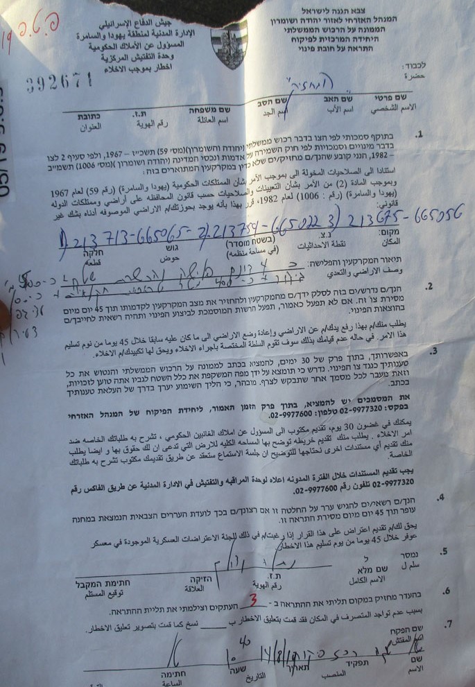 In 1982, Israeli occupation authorities declared 1250 dunums (308 acres) of Farkha’s land, in an area called Batin, “state land.” Occupation authorities have used state land to legalize the theft of land from Palestinians since the 1970s. Today, 22% of the total area of the West Bank is state land.